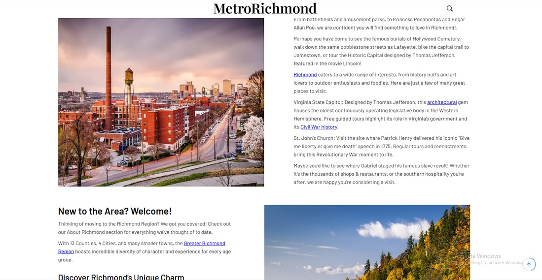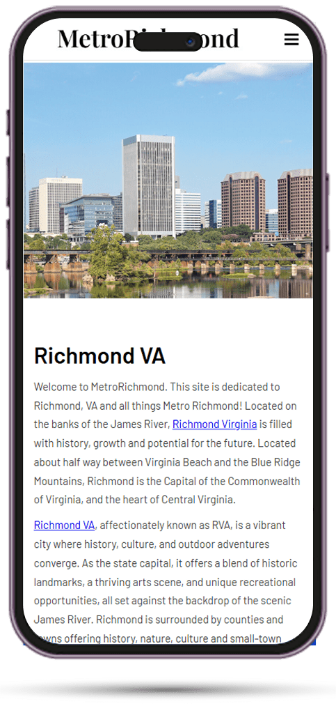 Welcome to MetroRichmond. This site is dedicated to Richmond, VA and all things Metro Richmond! Located on the banks of the James River, Richmond Virginia is filled with history, growth and potential for the future. Located about half way between Virginia Beach and the Blue Ridge Mountains, Richmond is the Capital of the Commonwealth of Virginia, and the heart of Central Virginia.